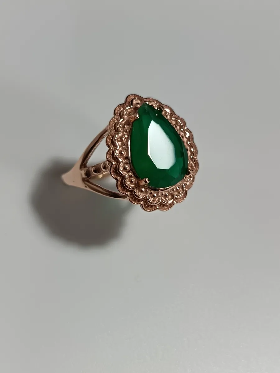 Центральным акцентом кольца служит изумрудно-зеленый агат грушевидной формы размером 8*12 мм, который словно хранит в себе первые лучи весны. Оттенок камня напоминает свежесть пробудившейся природы, наполняя владелицу энергией и позитивом.