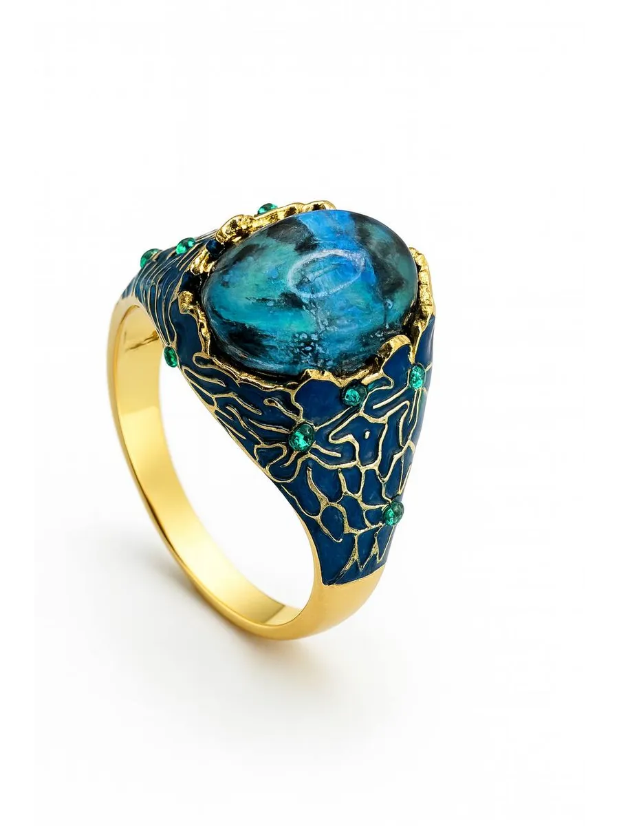 Кольцо "Ренессанс" — это изысканное украшение, созданное для женщин, которые стремятся выделиться своей уникальностью и стилем. Это бижутерное кольцо выполнено из высококачественного бижутерного сплава, что обеспечивает его долговечность и комфорт ношения. В центре композиции расположена вставка лабрадорит-имитация, играющая переливами цвета и добавляющая загадочности образу. Дополнительное декорирование эмалью и искрящимися фианитами придает изделию неповторимый блеск и утонченность. "Ренессанс" станет идеальным аксессуаром для тех, кто любит яркие акценты и стремится подчеркнуть свою индивидуальность.