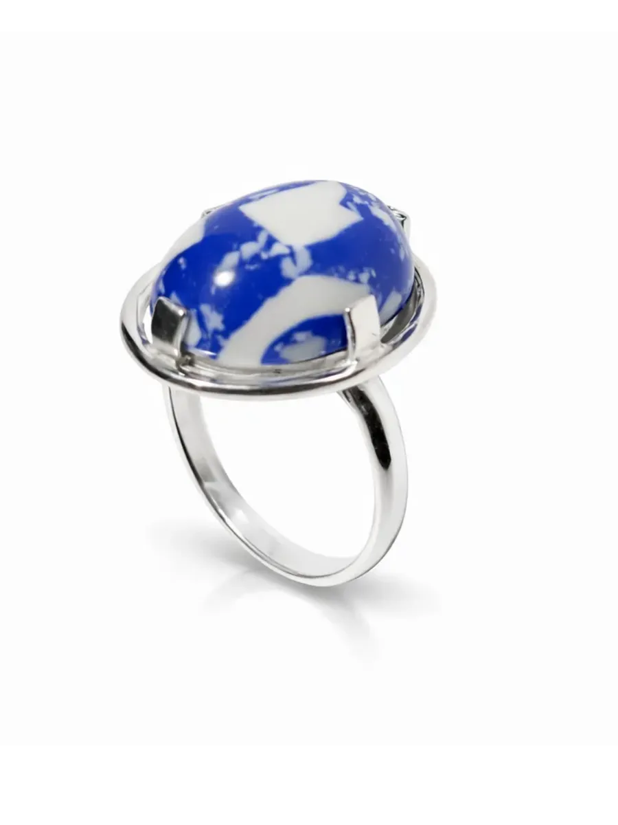 Центральным элементом кольца служит синтетический лазурит овальной формы размером 13x18 мм. Его оттенки создают неповторимый акцент, напоминая знаменитые узоры "Гжель" – символ российской культуры и традиций. Средний вес кольца составляет 4,2 грамма.