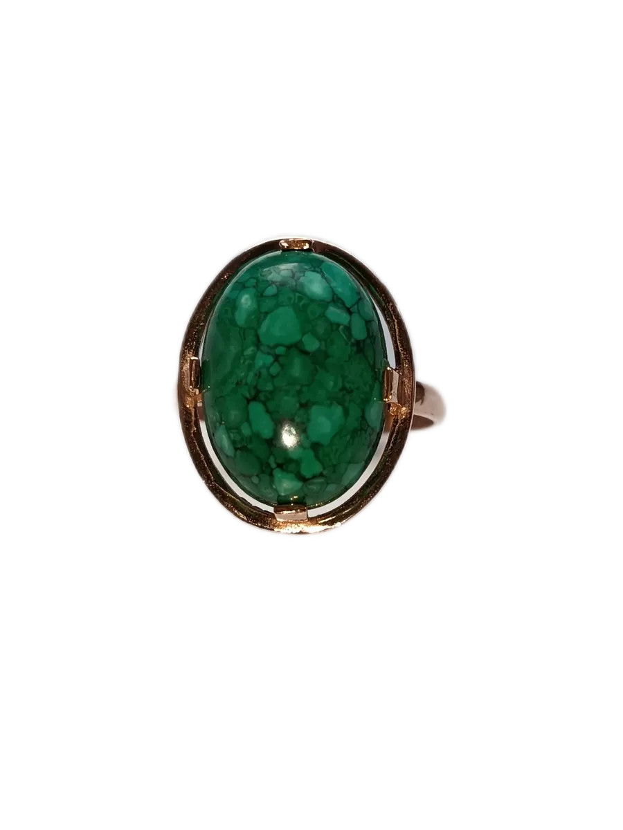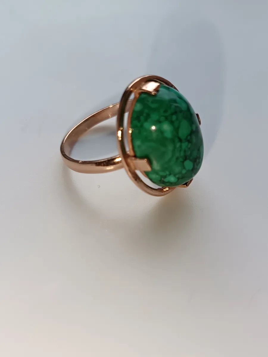 Изящный овал реконструированного малахита придает кольцу уникальный и яркий акцент, а его насыщенные зеленые оттенки прекрасно сочетаются с золотым покрытием. Это кольцо станет не только стильным аксессуаром, но и символом вашего утонченного вкуса.