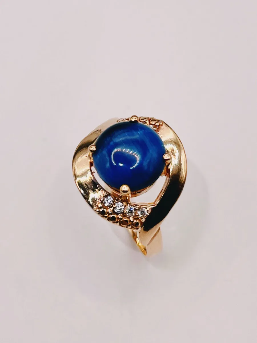 Центральным элементом кольца является вставка из кошачьего глаза сапфирового оттенка диаметром 9,0 мм, которая играет светом и создает загадочный эффект. Этот камень известен своими магическими свойствами, способствующими интуиции и внутреннему спокойствию.