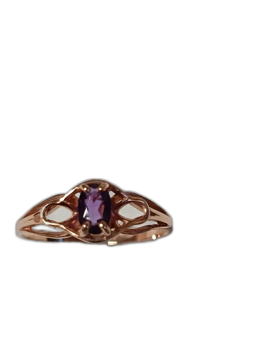 В центре кольца расположена изящная вставка — овал аметиста размером 4x6 мм весом 0,45 карата. Этот камень обладает глубокой фиолетовой окраской и известен своими мистическими свойствами, что делает его не только красивым, но и символичным выбором.