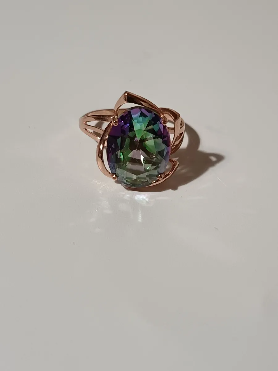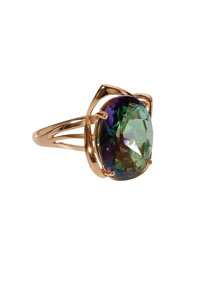 Главной гордостью этого кольца является крупная вставка из кварца мистик размером овал 12-16 мм, которая сияет подобно северному сиянию, создавая завораживающее световое шоу каждый раз, когда луч света коснётся её поверхности. Средний вес кольца 3,4 грамма. Это кольцо сочетает в себе элегантность и легкость, делая его идеальным дополнением к любому образу.