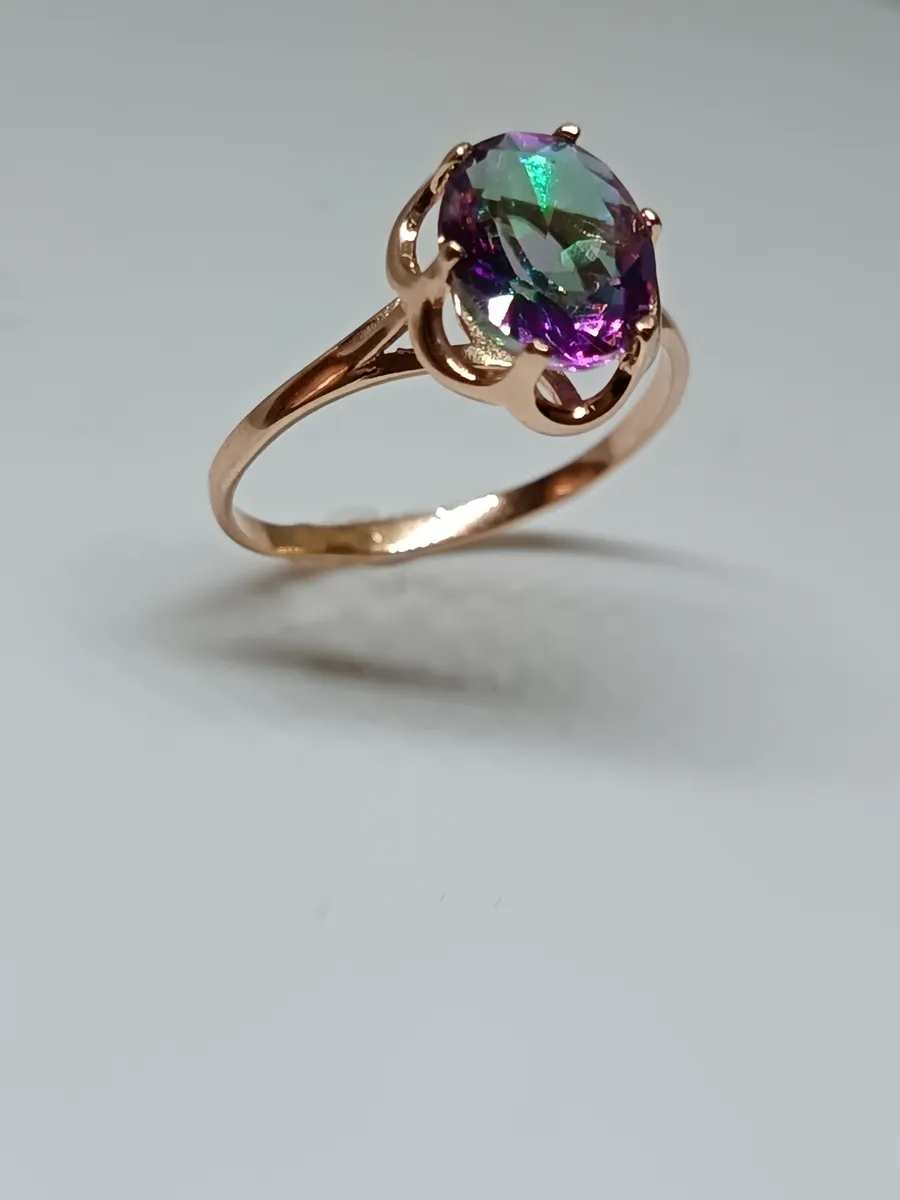 В центре внимания кольца находится великолепная вставка из синтетического кварца "мистик", который переливается яркими цветами и создает эффект загадки и волшебства. Этот камень не только привлекает взгляды, но и символизирует гармонию и внутренний покой.