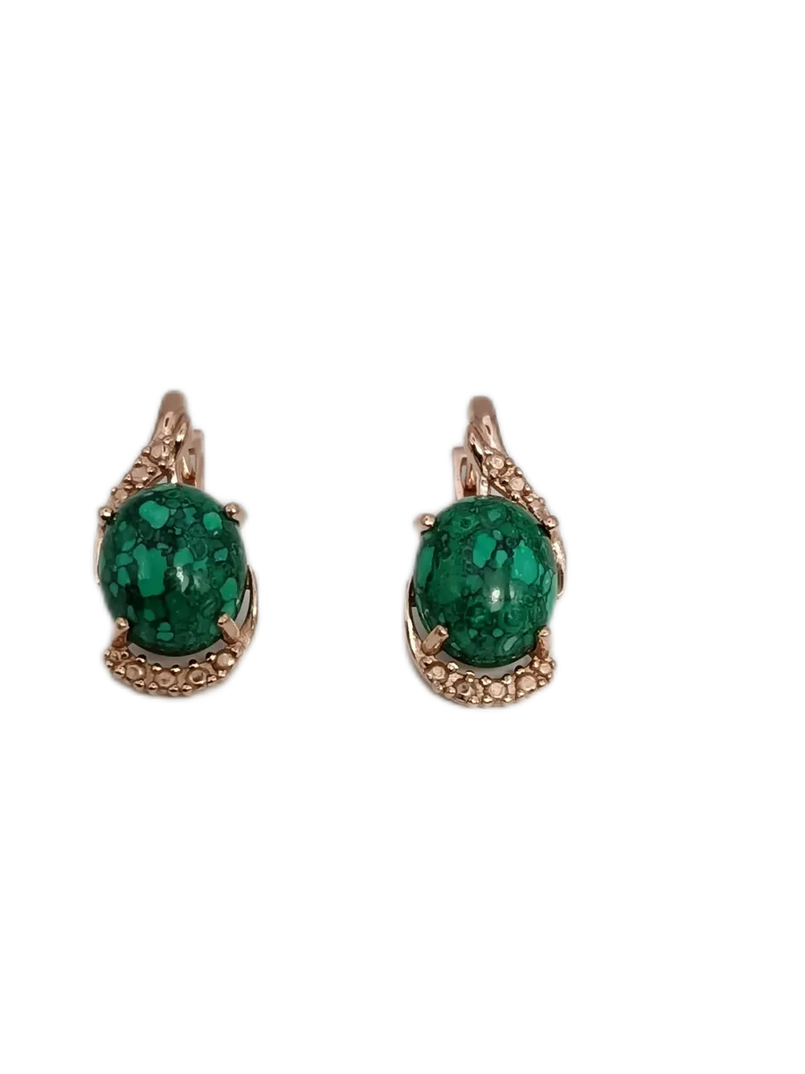 Элегантные серьги из бижутерного сплава с позолотой. Вставка — реконструированный малахит овальной формы размером 10×12 мм, которая придает украшению насыщенный зелёный оттенок и особый шарм. Длина серьги составляет 25 мм, глубина швензы — 8 мм, что обеспечивает комфортное ношение. Средний вес — 4,5 грамма. Эти стильные серьги станут отличным дополнением к вашему образу и подчеркнут вашу индивидуальность.