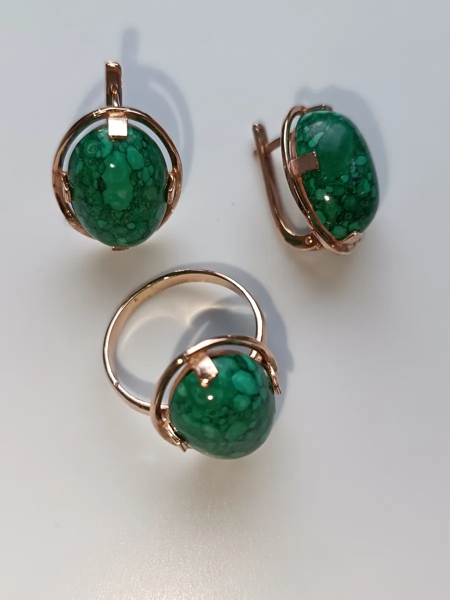 - **Вставка:** Реконструированный малахит в форме овала размером 13*18 мм, который добавляет серьгам яркости и глубины