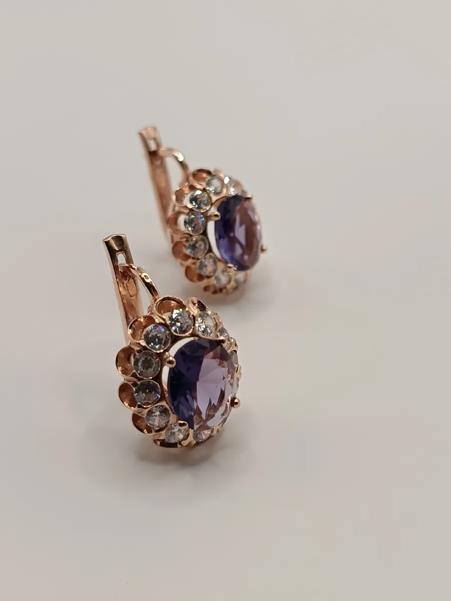 Эти роскошные серьги станут настоящим украшением вашего образа! Изделие выполнено из благородного серебра 925 пробы с изысканным золотым покрытием, что придает изделию особую глубину и блеск. Центральный акцент занимают аметисты выращенные, овальной формы размером 8x10 мм, окружённые сверкающим обрамлением из бриллианитов. Элегантность и надежность обеспечены английским замком. Среднее значение веса пары составляет 6,16 грамма, а длина каждой серьги — 20 мм, что делает их идеальным сочетанием стиля и комфорта. Глубокая швенза (9 мм) гарантирует удобное ношение. Эти серьги идеально подчеркнут вашу индивидуальность и станут прекрасным подарком.